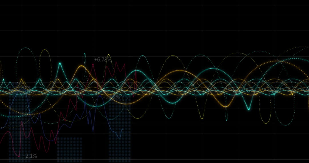 Bright waveforms intersect over a black background, illustrating complexities of data processing and digital technology. Useful for representing global communication concepts or innovations in data analysis and artificial intelligence presentations.
