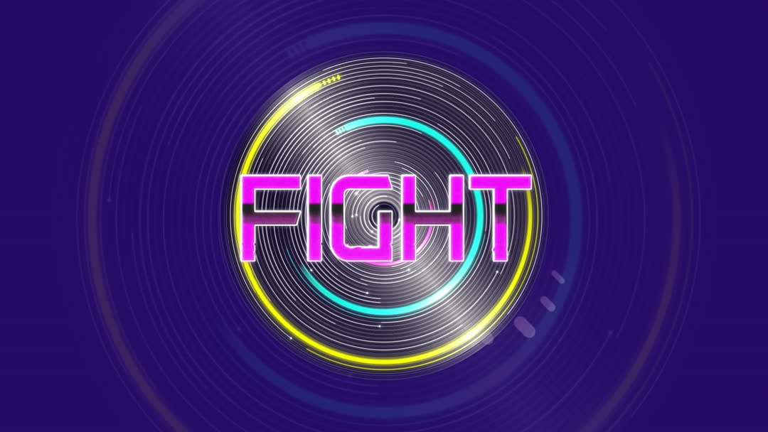 Dynamic design featuring bold neon text 'FIGHT' blending with vibrant rings on a purple background. Perfect for gaming content, technology themes, online forums, or digital marketing visuals focusing on energetic and futuristic styles.