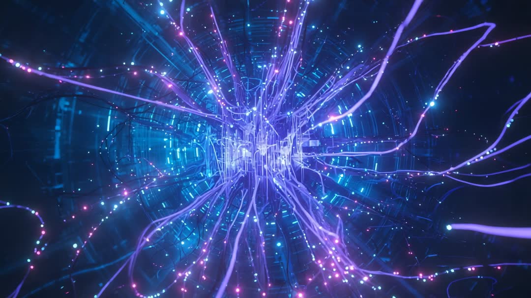 AI Generated Image. Captures vibrant scene of glowing strands and pulsating core representing digital connections and innovation. Useful for showcasing advancements in technology, AI, or network infrastructure. Ideal for presentations, tech blogs, and concept illustrations.