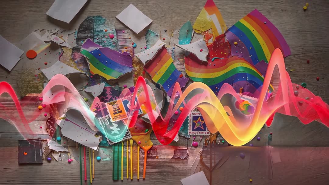 AI Generated Image. This vibrant visual showcases neon waves artistically interacting with an eclectic mix of colorful elements, including paper cutouts, stamps, and beads on a wooden surface. The dynamic scene represents innovation and creativity, where colors burst forth in an artistic dance. Perfect for content about creative inspiration, modern art themes, showcasing kinetic designs or as a visually captivating backdrop.