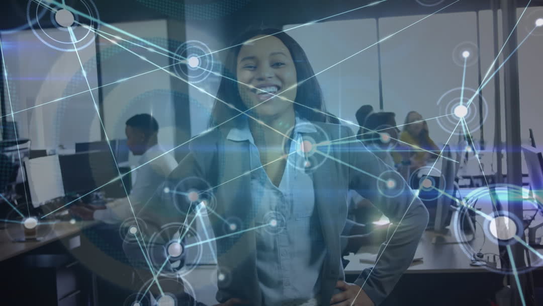 This video depicts a diverse professional in a modern office setting with a digital network overlay, symbolizing technology and connectivity in the workplace. It is ideal for illustrating concepts related to office digitization, teamwork, and global business connectivity. Perfect for use in articles or promotional material for tech companies, business innovation, and IT networking opportunities.