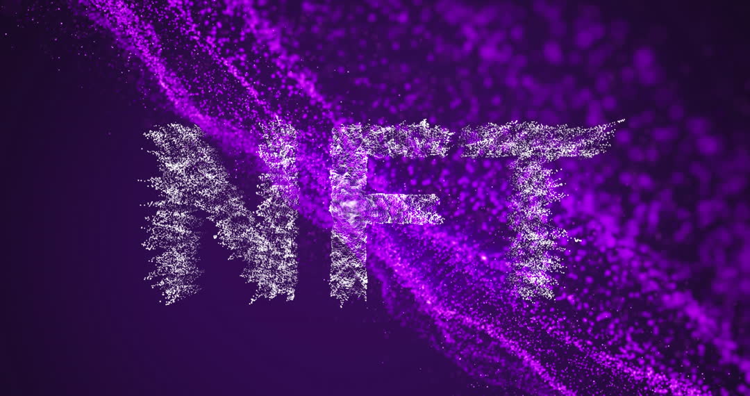This vibrant animation of 'NFT' formed by digital particles over a dynamic blue grid represents innovation in digital art and blockchain technology. Perfect for illustrating concepts related to NFTs, digital trading platforms, technology communication, or modern artistic expressions in a digital format.