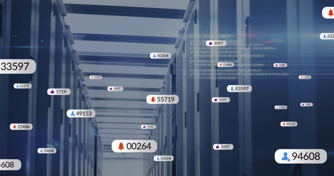 Digital graphical elements showing real-time notification badges moving amidst network server aisles represent the dynamic nature of modern technology systems. Suitable for illustrating concepts related to data management, technological infrastructure, and cybersecurity alerts, useful in content highlighting network oversight or technological advancements.