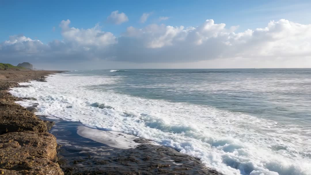 AI Generated Image. This video captures the dynamic scene of ocean waves crashing energetically against a rocky shoreline, ejecting fresh frothy foam and sea spray, under a partly cloudy blue sky. It highlights the raw beauty of natural coastal landscapes, ideal for use in projects focused on the ocean's energy, resilience, or environmental aspects. Suitable for backgrounds, travel promotions, or educational material on marine environments.
