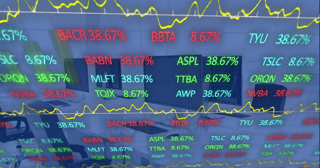 Displays an innovative concept mixing a city office building with dynamic stocks and shares data. Great for illustrating concepts in financial reports, investment brochures, or marketing material for finance-related businesses.