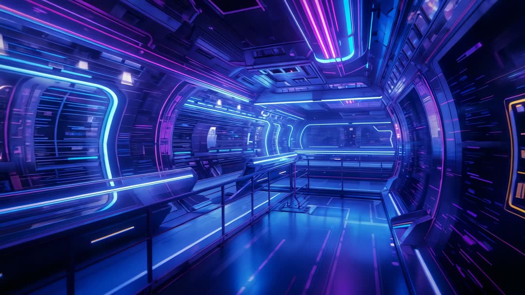 AI Generated Image. This AI-generated video captures a sleek and cutting-edge corridor illuminated by vibrant neon lights. The setting is highly futuristic with shifting light strips, safety rails, and tech-inspired details suggestive of a spaceship or a advanced technological environment. Ideal for use in sci-fi movies, tech or innovation shows or presentations focused on modern architecture, digital transformation, or cutting-edge design.