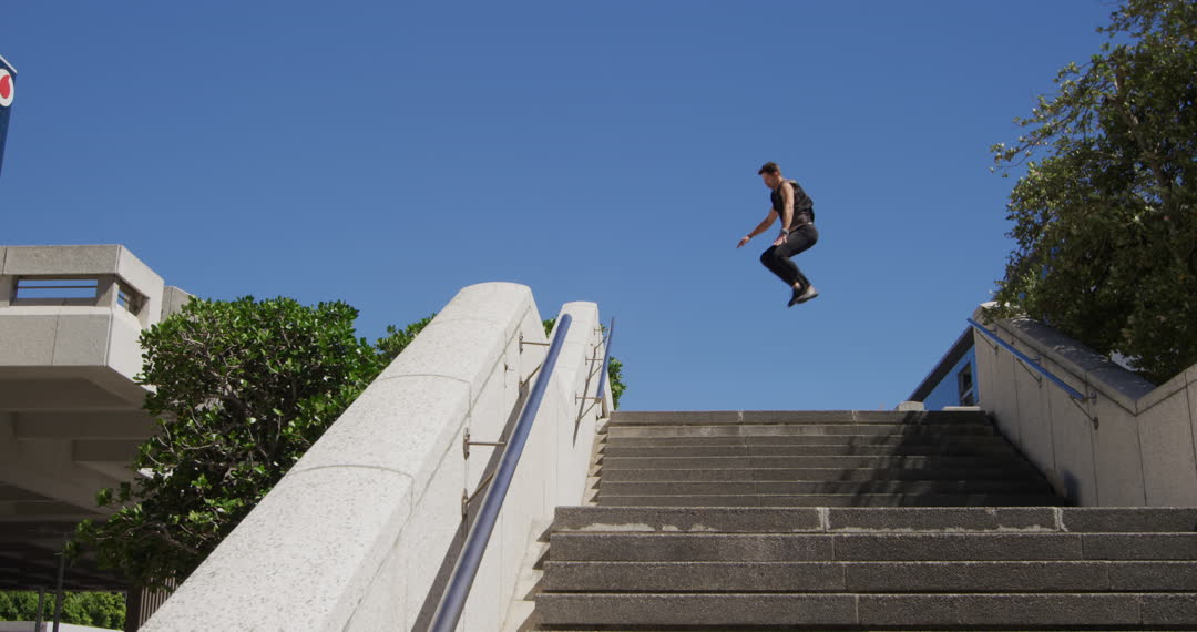- Dynamic Parkour Athlete Jumping Down Staircase in Urban Environment