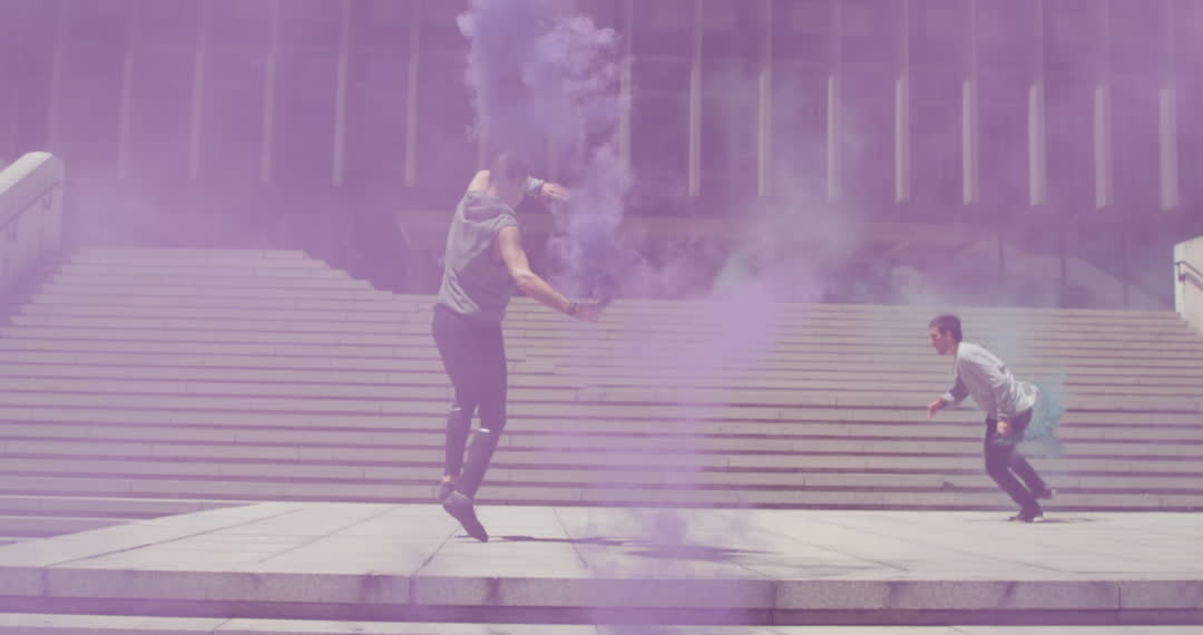 Energetic scene of two men actively performing parkour in front of a modern building. Captured on a clear, sunny day with vibrant smoke trails trailing behind their dynamic steps, this scene highlights agility and boldness amidst urban architecture. Useful for illustrating active lifestyles, urban exploration, or advertisements targeting thrill seekers and extreme sports enthusiasts.