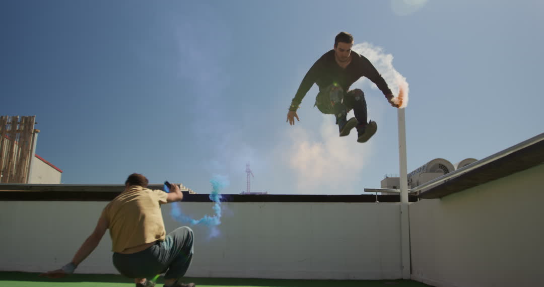 Dynamic Parkour Stunt on Urban Rooftop with Smoke Flares Video