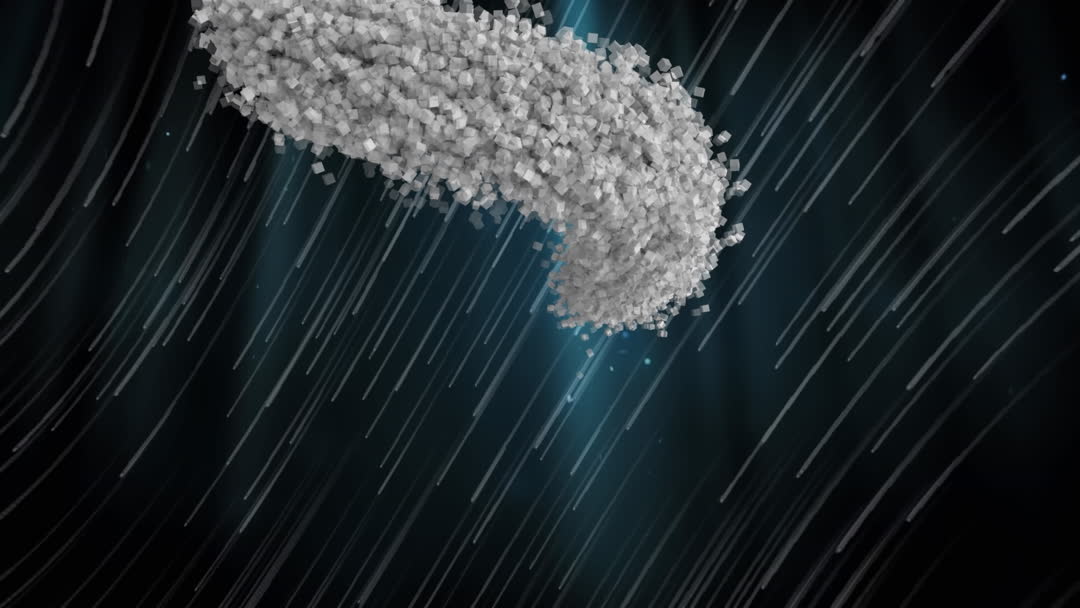 The scene depicts small particles dynamically forming a human head model while luminous light trails enhance the composition against a dark background, capturing the synergy of digital art and human identity. This animation illustrates concepts in medical research and science technology, making it suitable for educational content in healthcare innovations or digital art showcases. It might be used in presentations or videos about developing new medical or technological advancements.