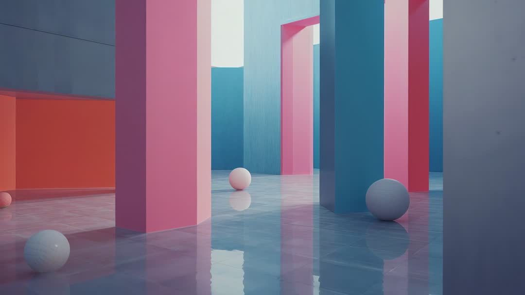 AI Generated Video. Playing with pastel pillars and reflective floors, focusing on minimalist, geometric beauty. Ideal for modern art showcases, design inspiration boards, abstract wallpaper backgrounds, or educational resources exploring the crossing of traditional art with technology.