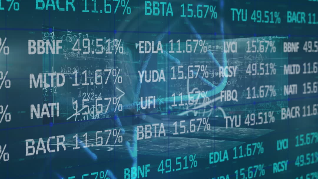 This video projects financial stock market data alongside DNA strands and complex mathematical equations, representing an intersection of finance and genetics driven by advanced computation. Useful for illustrating themes of scientific research, technological advances, and data analysis in presentations, articles, or educational materials.