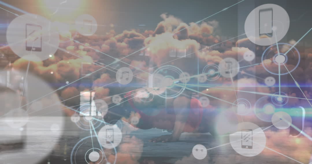 Visual concept blending the digital realm with fitness, depicting an African American man perform push-ups amid a network of connection icons overlaid with clouds. Suitable for illustrating technology integration in fitness and lifestyle, futuristic exercise routines, cyber health, and innovative workout concepts.