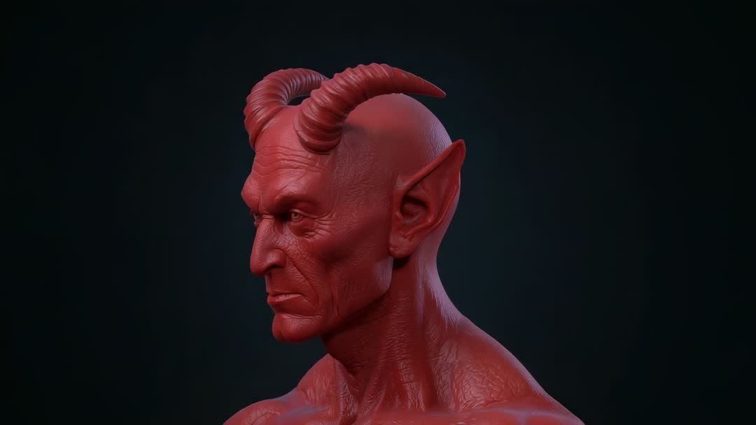 AI Generated Image. Video showcases a digitally rendered stylized demon bust rotating slowly in studio setup. Features include prominent curved horns and textured skin, highlighting craft in character creation. Useful for fantasy concept art, horror game design references, or showcases in digital art portfolios, ideal for where dark fantasy themes are applicable.