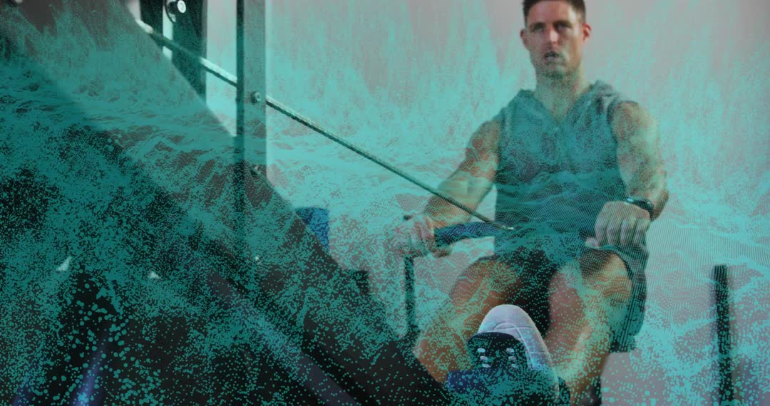 Scene captures man engaged in rowing exercise, highlighting fitness and strength activities while featuring overlay of turquoise digital particles, adding modern and energetic touch. Rowing exercise symbolizes cardiovascular training, muscle building, health improvement. Useful for fitness promotions, health articles, strengthening body themes.