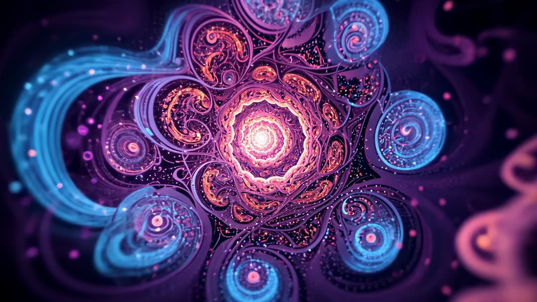 AI Generated Image. Sequence showcasing dynamic movement through intricate fractal tunnel with glowing spirals and orbs. Vibrant mix of colors and psychedelic patterns emphasizes a cosmic feel. Ideal for use in projects involving futuristic technology, digital art presentations, or background designs with an abstract aesthetic.