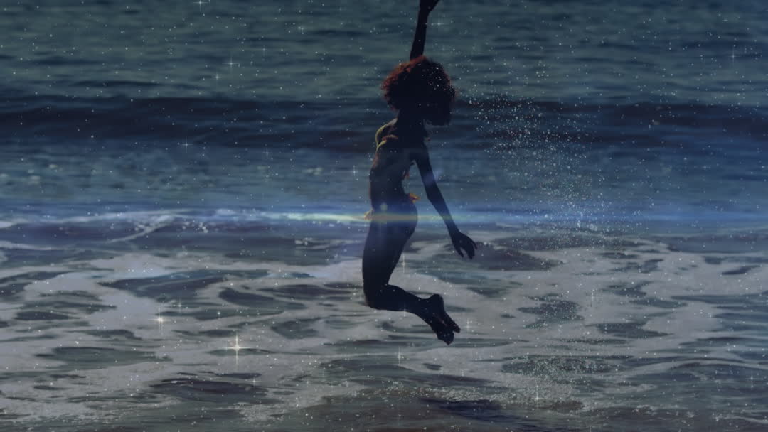 Energizing scene of a woman's silhouette exuding joy as she jumps on a beach, splashing water and dynamic light accents on scene. Suitable for conveying themes of summer, freedom, joy, and outdoor leisure, great for travel campaigns, summer promotions, and wellness projects.
