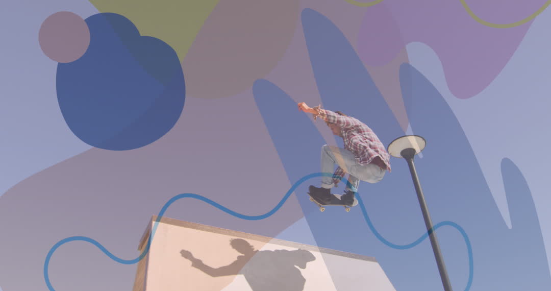 Energetic scene highlighting a skateboarder performing a jump interspersed with vivid abstract shapes, conveying a blend of physical intensity and creative flow. The vivid graphics represent an artistic graphic overlay suitable for creative projects or editorials focused on lifestyle, modern sports, innovation in art and design.
