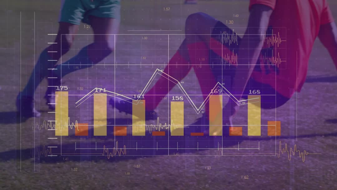 Image depicts athletes playing soccer with overlay of data charts and statistics, indicating the integration of sports and digital technology for analyzing player movements and game strategies. Ideal for illustrating topics on sports analytics, real-time performance tracking, athletic training systems, or the impact of technology on competitive sports. Useful for articles, presentations, or websites focused on innovations in sports training and competitive strategy development.