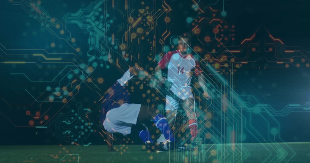 A compelling scene captures two male athletes engaged in an intense soccer match, illuminated by field lights. Innovative circuit patterns overlay the players, creating a futuristic and dynamic tension. This visual representation is perfect for themes related to the integration of sports and technology, showcasing innovation and athletic prowess. Ideal for advertisements, editorial content on the future of sports technologies, or visuals for sports technology conferences.