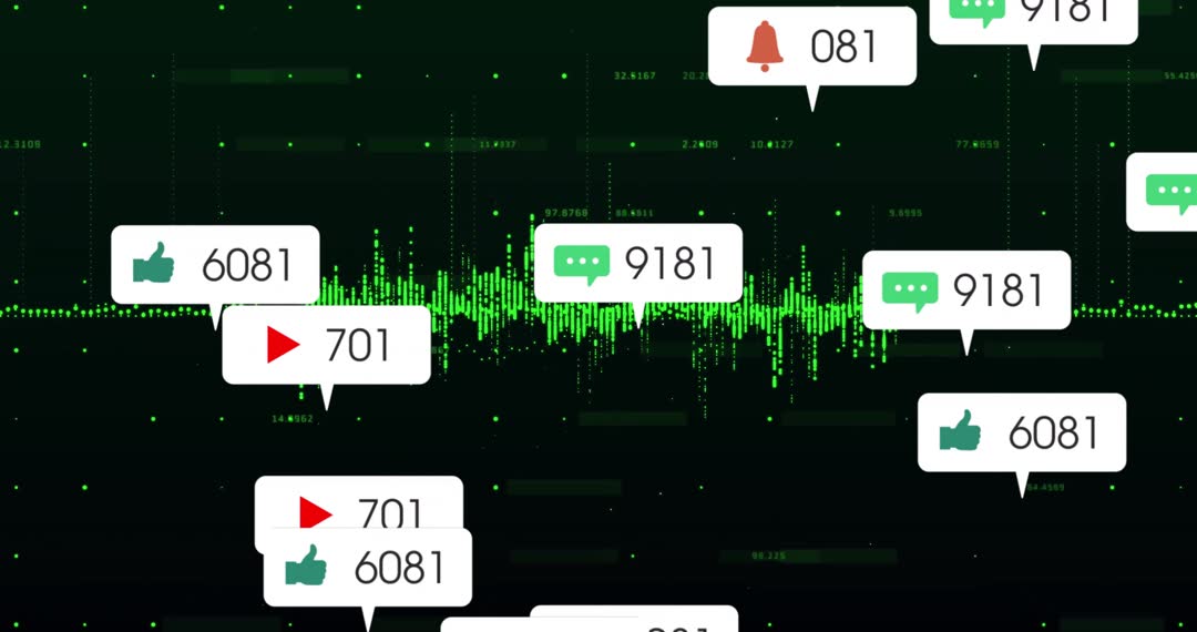 Green waveform host dynamic notification bubbles with rising counts, representing data such as likes, comments, or shares in a digital UI interface. Visualization highlights social media engagement and is ideal for tech presentations, data analytics platforms, and educational content focused on social media or technology trends.