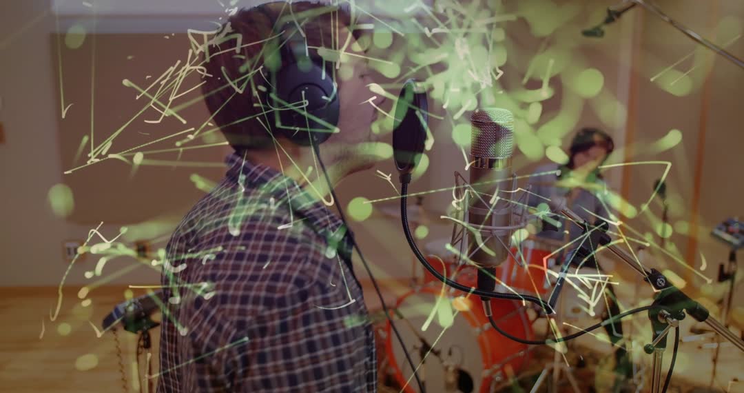 This video captures an energetic music session in a recording studio, with artists immersed in their performance. The overlay of green light streaks adds a vibrant, dynamic energy, suggesting creativity and innovation. Ideal for use in advertising music studios, promoting audio equipment, illustrating music websites, band promotions, and emphasizing creative collaboration and dynamic energy in music creation.