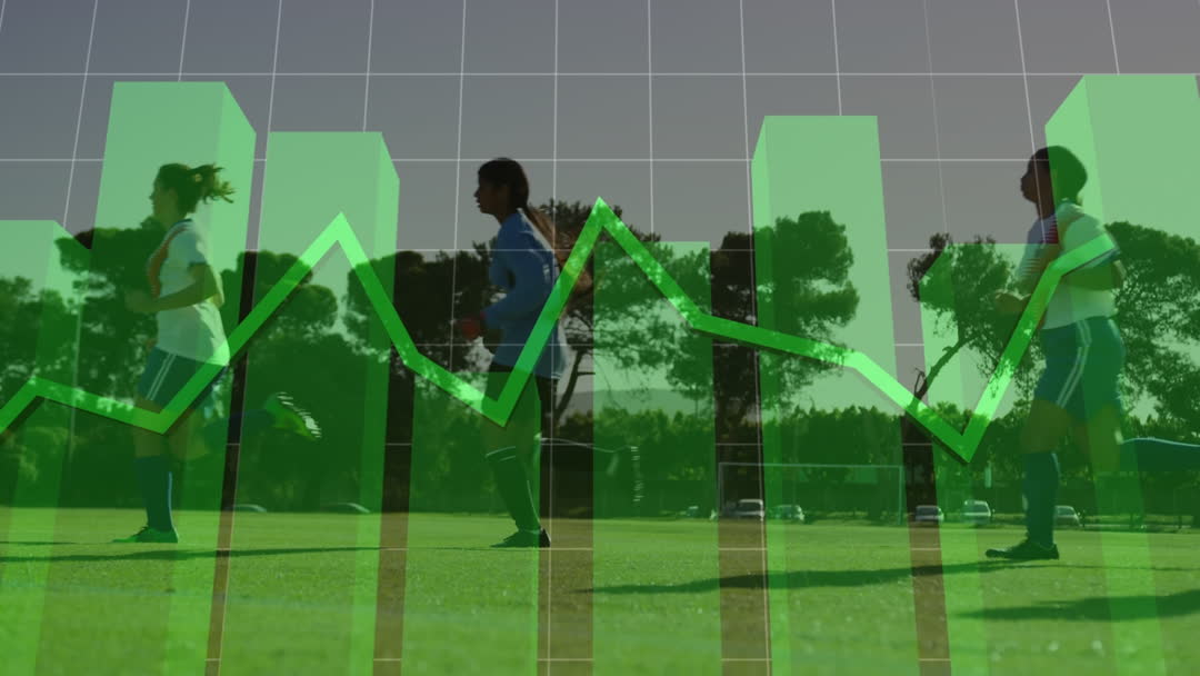 Female soccer players running on field overlaid with graph of data analytics, showcasing connection between sports performance and statistical evaluation. Ideal for illustrating sports science, data-driven athlete training, and diversity in sports promotions.