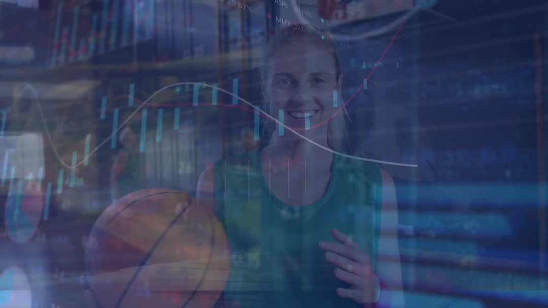 Visually captivating blend of a female basketball player merged with stock market graphs and data points, illustrating a connection between sports and business. This dynamic composition could be ideal for content related to business intelligence, sporty applications, innovative media projects, integrated marketing campaigns, or platforms highlighting the interface of athletic data with financial analysis.