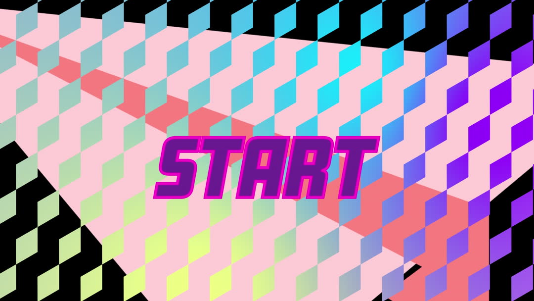 Colorful and dynamic animation designed as a start screen for video games or digital entertainment. Intersecting geometric diamond shapes provide an engaging visual effect, drawing viewers into virtual experiences. Perfect for use in video game production, entertainment networking, and digital marketing materials looking to capture attention with bold graphics.