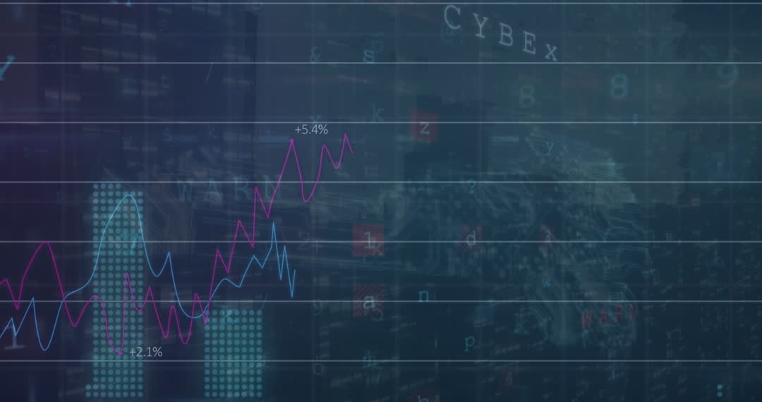 Dynamic data visualization showcasing animated statistics and graphs over a digital grid, perfect for illustrating topics related to data analytics, cyber technology, or global digital trends. Suitable for use in presentations, tech blogs, or educational content exploring data processing and analysis in a digital context.