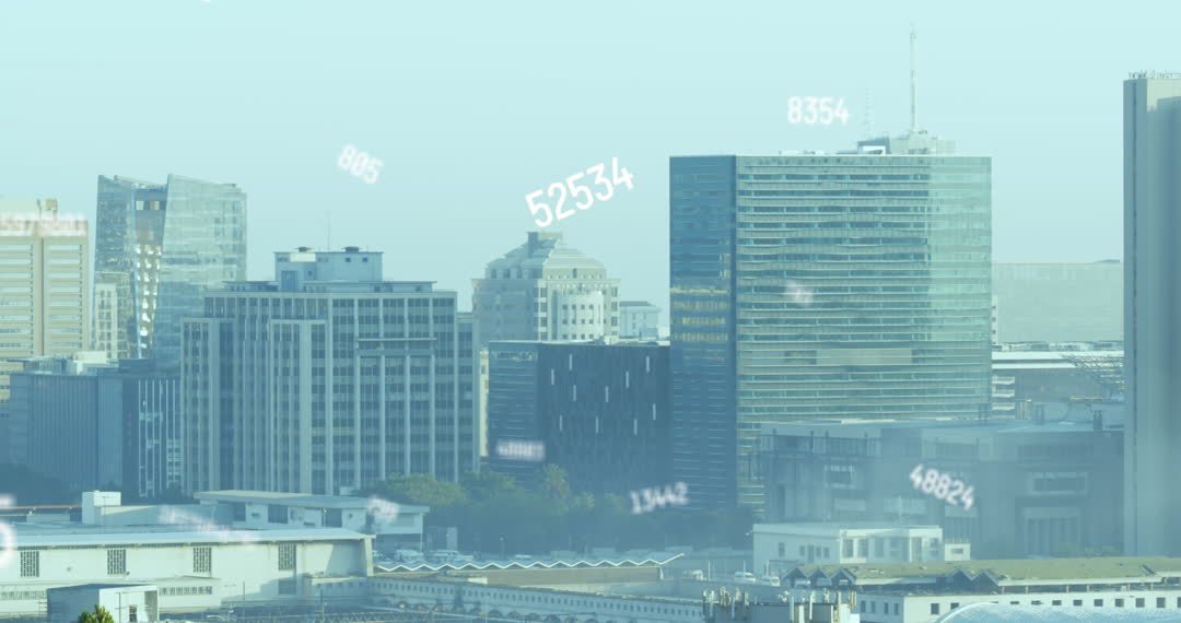 Numbers dynamically floating over an urban skyline create an impression of evolving business technology and data analysis. This can be used to represent the concept of smart cities, data analytics in urban planning, or futuristic business insights in various multimedia projects or presentations about innovation and technology.