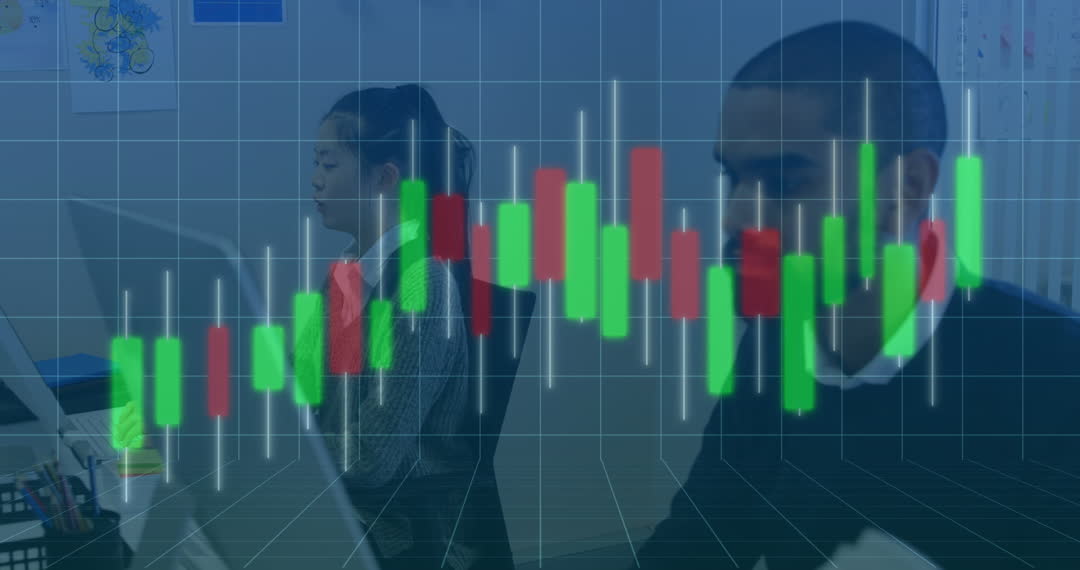 A diverse team of coworkers is focused on their desktop computers, with digital graphics of stock market trends and bar charts superimposed onto the video. This conveys a high-tech business environment involving financial analysis and evaluation. Perfect for use in business presentations about stock trading, financial reports, technology in finance, or teamwork efficiency in a modern office setting.