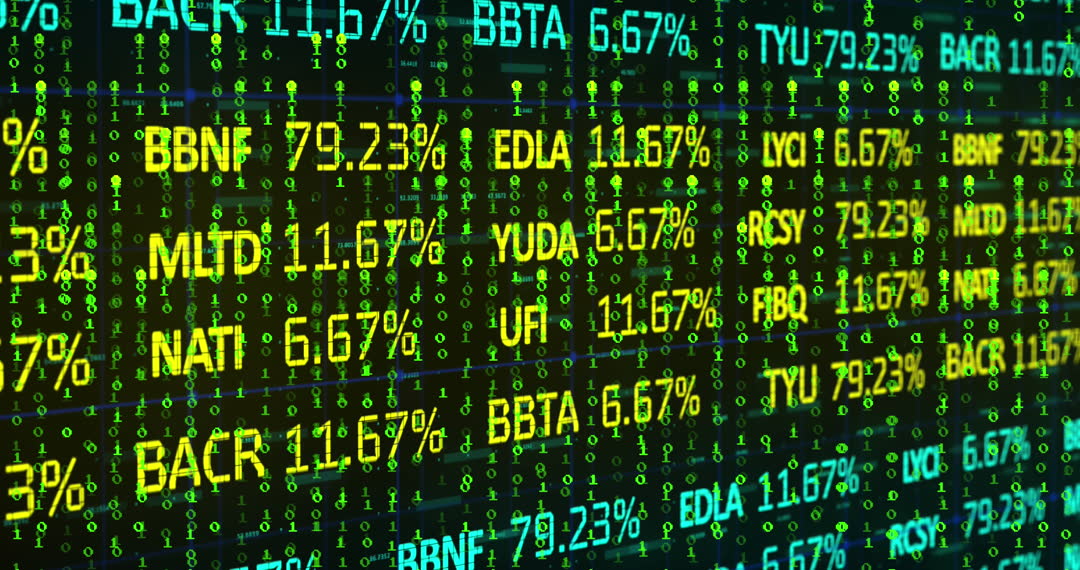Colorful stock market data with binary coding showing current trends in finance. Digital numbers overlay imply technological advances in trading systems. Perfect for illustrating themes related to cryptocurrency, algorithmic trading platforms, data analytics in finance, or educational materials on global economic trends.