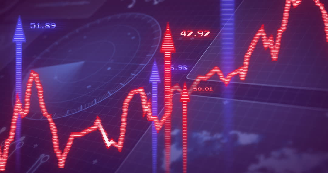This video illustrates a high-tech data visualization featuring animated elements and arrows representing stock market fluctuations. Ideal for use in presentations on finance, technology, and economic forecasting, this dynamic video can be effectively utilized in marketing materials, educational content, or financial reports to convey concepts related to stock markets and digital data analysis.