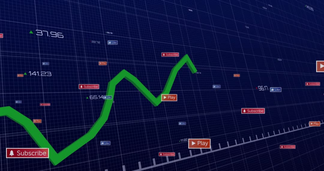 This dynamic clip shows a green line graph reflecting subscriber trends on a digital interface filled with floating icons and numerical data, providing insights into analytics and statistics. Ideal for presentations on technology in data analysis, showcasing software interfaces for business growth, or illustrating digital transformation in user engagement calculations.