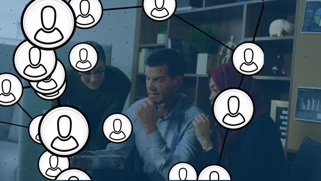 Shows a collaborative situation with business professionals working together in an office setting while digital icons illustrate a connected network. Useful for presentations on modern teamwork, digital connectivity concepts, or advertisements highlighting innovative workplace solutions.