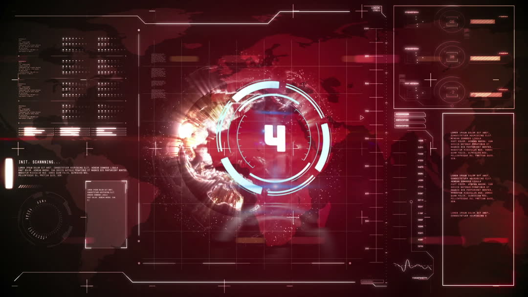 Dynamic tech interface showing countdown and scanning over data on a red digital screen. Ideal for use in technology promotions, high-tech corporations showcasing digital capabilities, or visualizing advanced data networks.