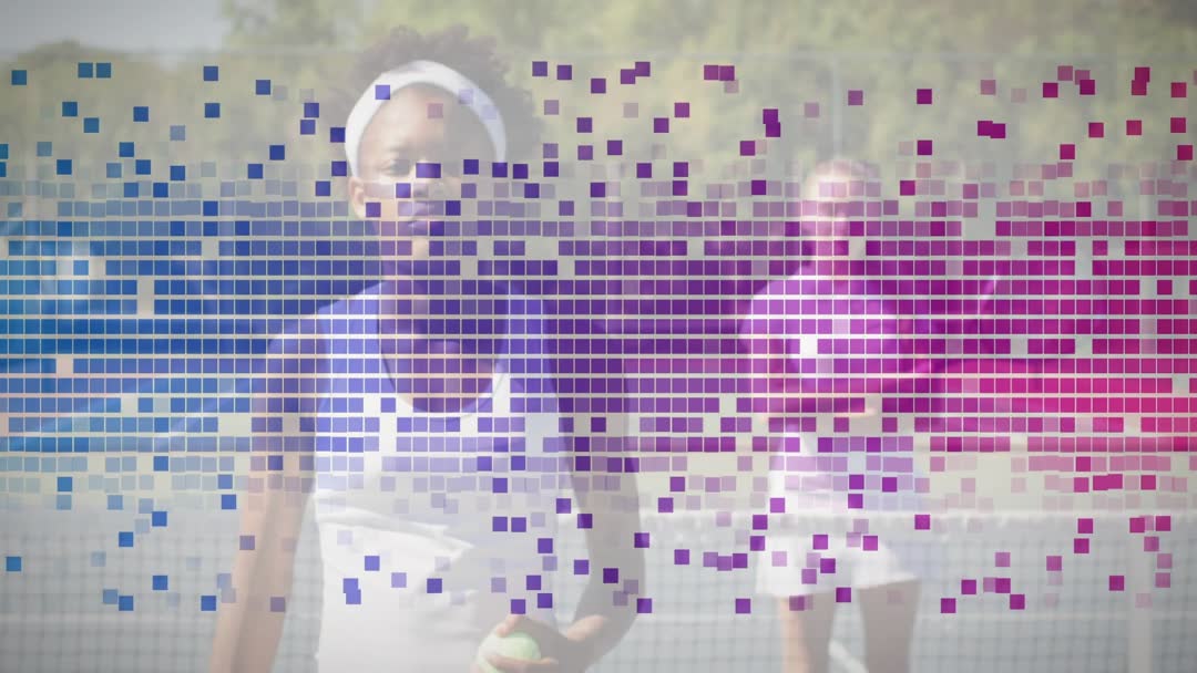 Two tennis players are seen on a hardcourt preparing to serve with a dynamic mosaic overlay adding energy and vibrancy to the scene. The focus on athleticism and preparation highlights their dedication to the game, as well as the partnership between them. Suitable for use in advertising campaigns promoting sportswear, athletic equipment, or fitness programs. Inspiring for use in materials discussing teamwork, competitiveness, or outdoor activities in vibrant, sunny climates.