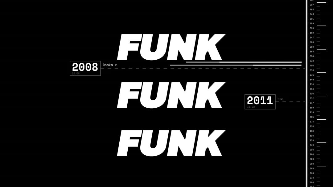 White text animation captures attention by highlighting dynamic graphics indicative of global business principles and financial concepts. Bold typography 'FUNK' present in a systematically ordered fashion augments focus on futuristic digital world navigation. Applicable for use in presentations, marketing materials, or broadcast designs exploring technology, global connections and innovative interface developments.