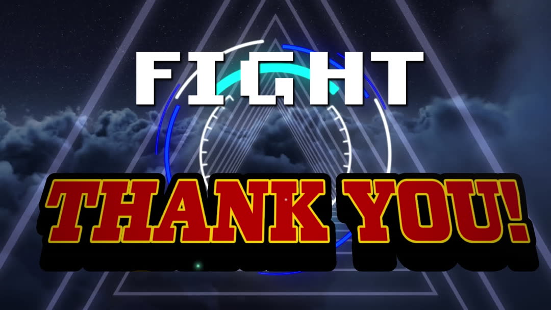This graphic features bold animated text with a video game motif, including prominent phrases 'FIGHT' and 'THANK YOU'. Set against a digital backdrop with abstract neon shapes and dark clouds contributing an ominous gaming atmosphere. Ideal for use in digital media promotions, video game developers, social media, and content creators seeking a gaming edge. Simulates virtual transport offering both gratitude and engagement in communication themes.