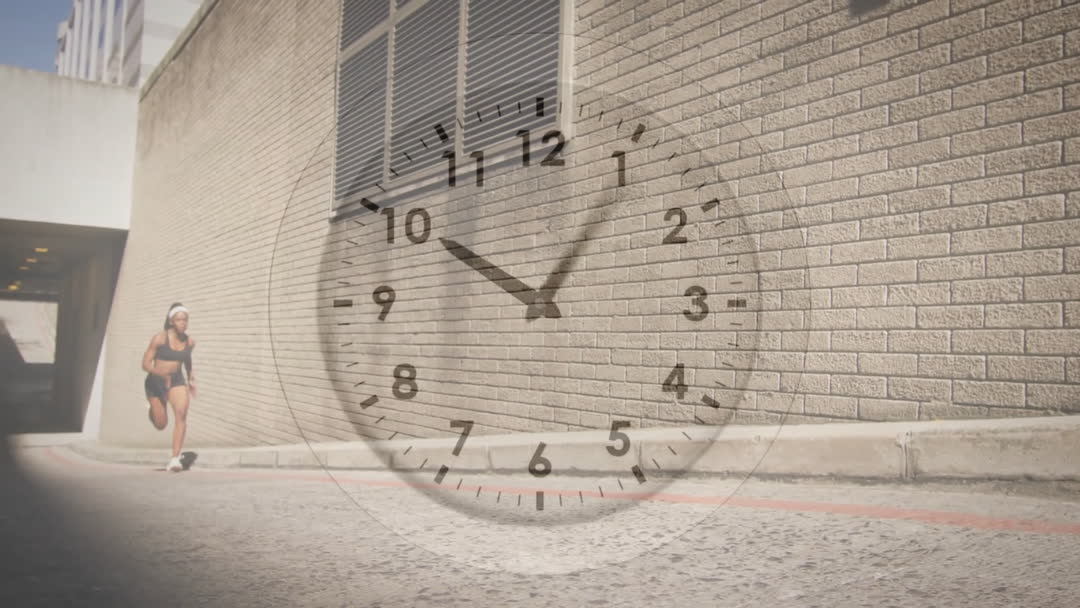 This stock video blends the concept of time management with an active, healthy lifestyle by overlaying a clock onto the scene of a woman running in a city environment. Useful for illustrating topics in fitness magazines, lifestyle blogs, or urban living websites, emphasizing both the importance of taking time for exercise and balancing daily schedules. Great for content that discusses the intersection of busy life and maintaining health and wellness routines in modern environments.