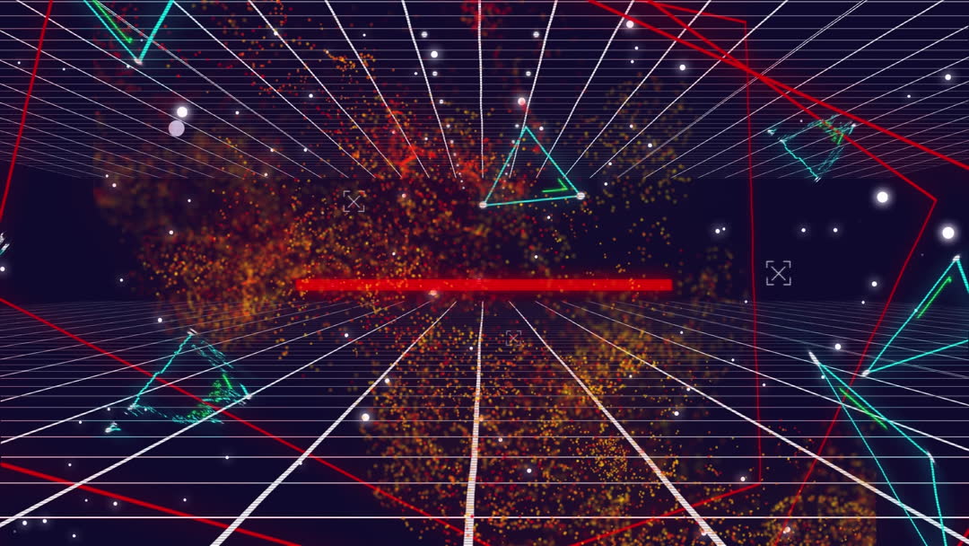 This animation features an array of glowing triangles and sparkling glitter moving smoothly through a digital space, set against a grid backdrop. The dynamic motion and vibrant colors make it an eye-catching piece. Ideal for use in videos, presentations, or as a background for websites needing a futuristic or tech-themed aesthetic.