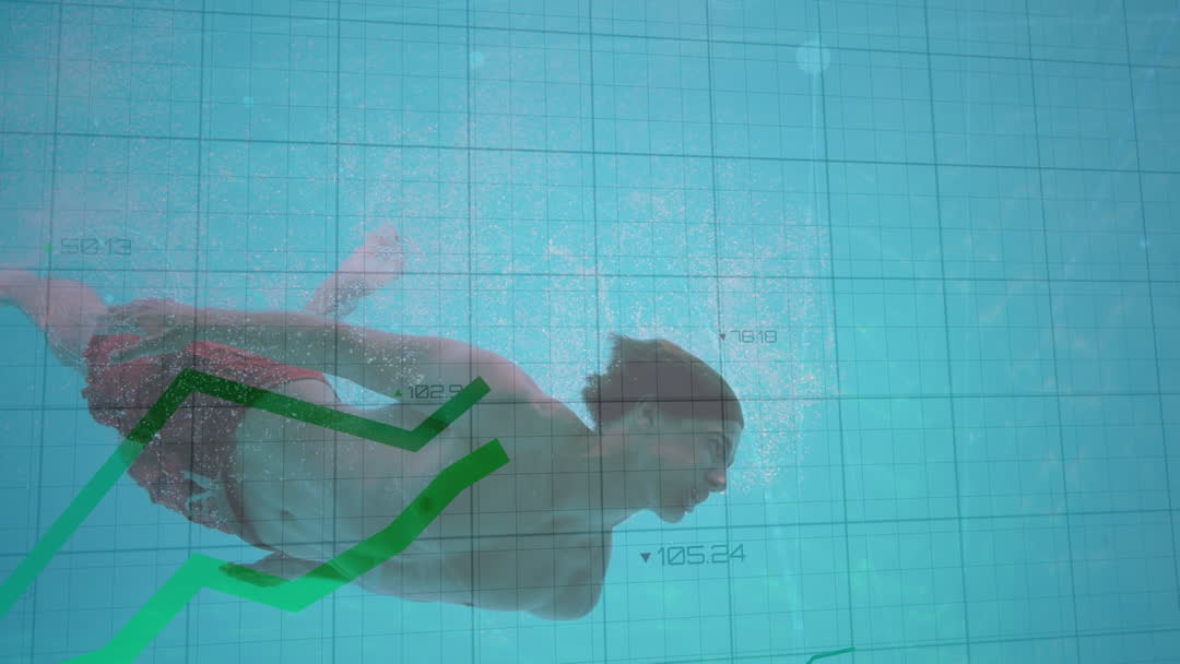 Man swims underwater in a pool, with a graphical overlay of financial data depicting growth and analysis. Scene symbolizes a synergy between active lifestyle and financial progress. Suitable for content on financial success, digital data, fitness applications, and health-related products embracing technology.