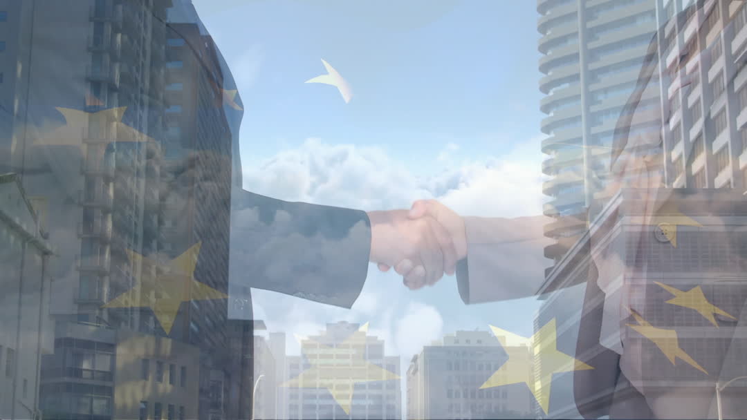 Two hands shaking over a cityscape enhanced with European Union motifs represents business collaboration and partnerships. Symbols like skyscrapers and stars emphasize global connections and innovation through technology. Ideal for illustrating concepts related to global business alliances, international cooperation, and technological advancement in the corporate world.