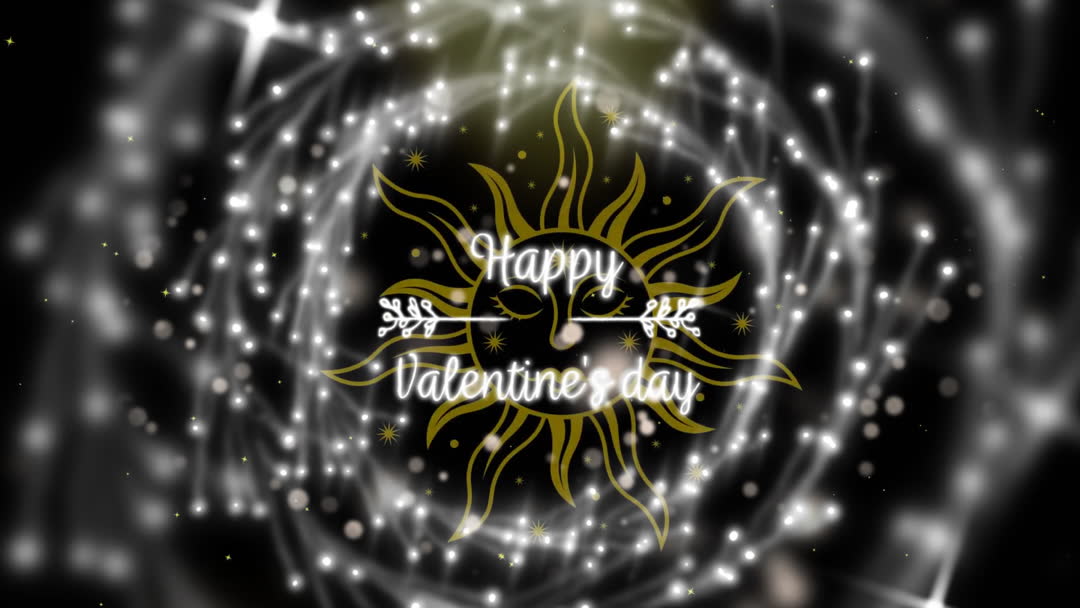 Vibrant animation featuring Valentine's Day message with stylish gold sun motif and swirling lights against black background. Ideal for themed digital greetings, love-focused presentations, and festive social media content.