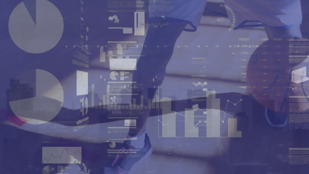 Basketball fused with data analytics creates vibrant videory suggesting innovation in sports technology. Useful for concepts involving sports performance analysis or merging traditional sports with modern data solutions.