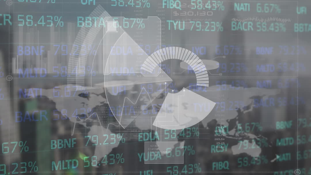 Animation overlays dynamic financial data, including stock prices and economic figures, on a world map backdrop. Presenting concepts of global finance and market analysis. Perfect for illustrating themes in business publications, financial analysis reports, and digital finance content.