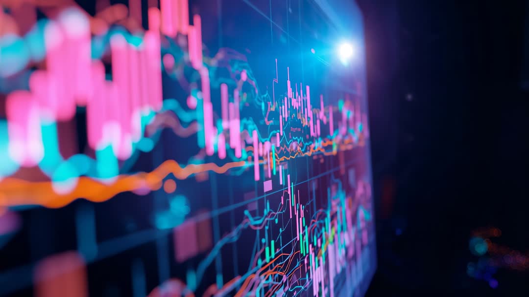 AI Generated Image. A vivid video scene reveals animated graphs and candlestick charts on glowing digital interfaces in a tech-driven control space. Perfect for showcasing themes related to digital transformation, AI analytics, and modern data science. Ideal for use in presentations, educational content on data visualization techniques, or a technology conference backdrop.
