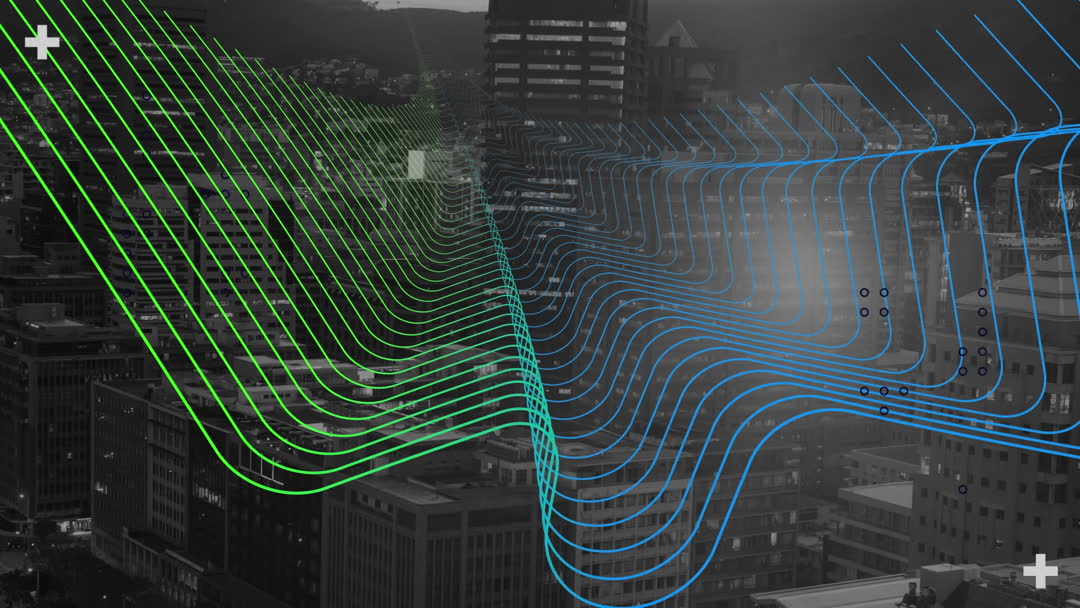Abstract wireframe overlays flow over an urban cityscape in grayscale, creating a futuristic visual effect. Adding a modern, technological vibe, this concept can be utilized in business presentations or tech-themed projects to illustrate innovative ideas or global connection insights.