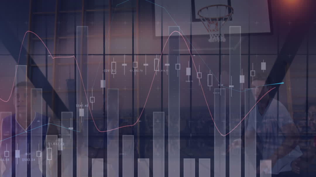 Digital visualization combines aspects of finance and team sports, portraying financial charts imposed against cityscape while showcasing basketball practice. Ideal for illustrating concepts around balancing financial trends with strategic teamwork in business and sports fields. Useful for articles on financial analysis, strategic planning workshops, or motivational content relating to improving team performance in both economics and sports disciplines.